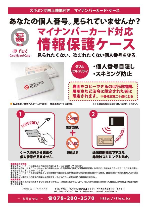 flux・マイナンバー目隠しカードケースは裏面の個人番号を目隠しするとともに、非接触通信でのスキミングを防ぐダブル・セキュリティ機能を提供します。